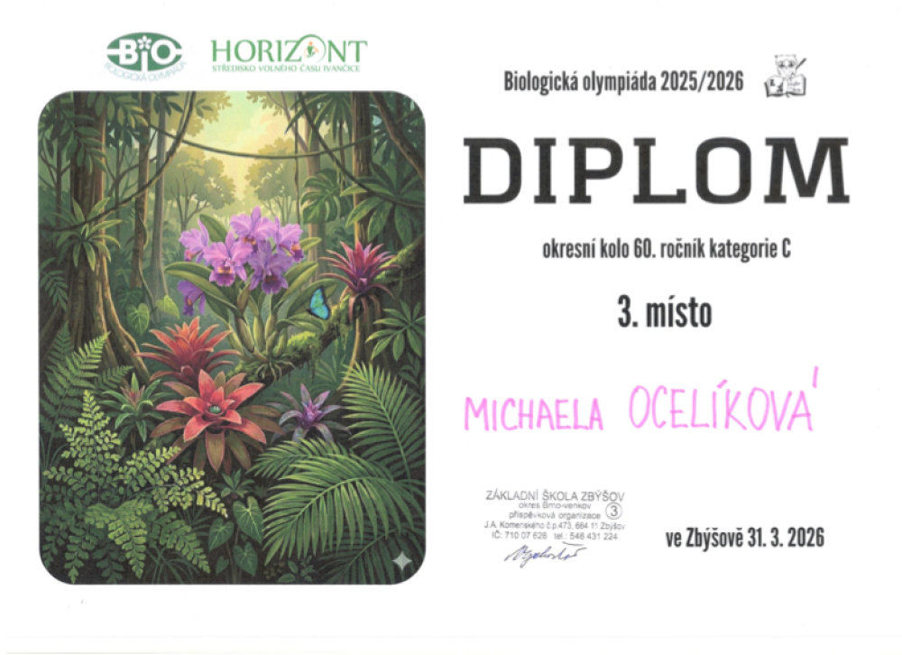 Naše žákyně Michaela Ocelíková (9.A) a Viktorie Troubilová (9.B) dosáhly skvělého úspěchu ve školním kole biologické olympiády, kde se umístily na prvních místech. Díky tomu postoupily do okresního kola, které se konalo 31. března ve Zbýšově (Brno-venkov).